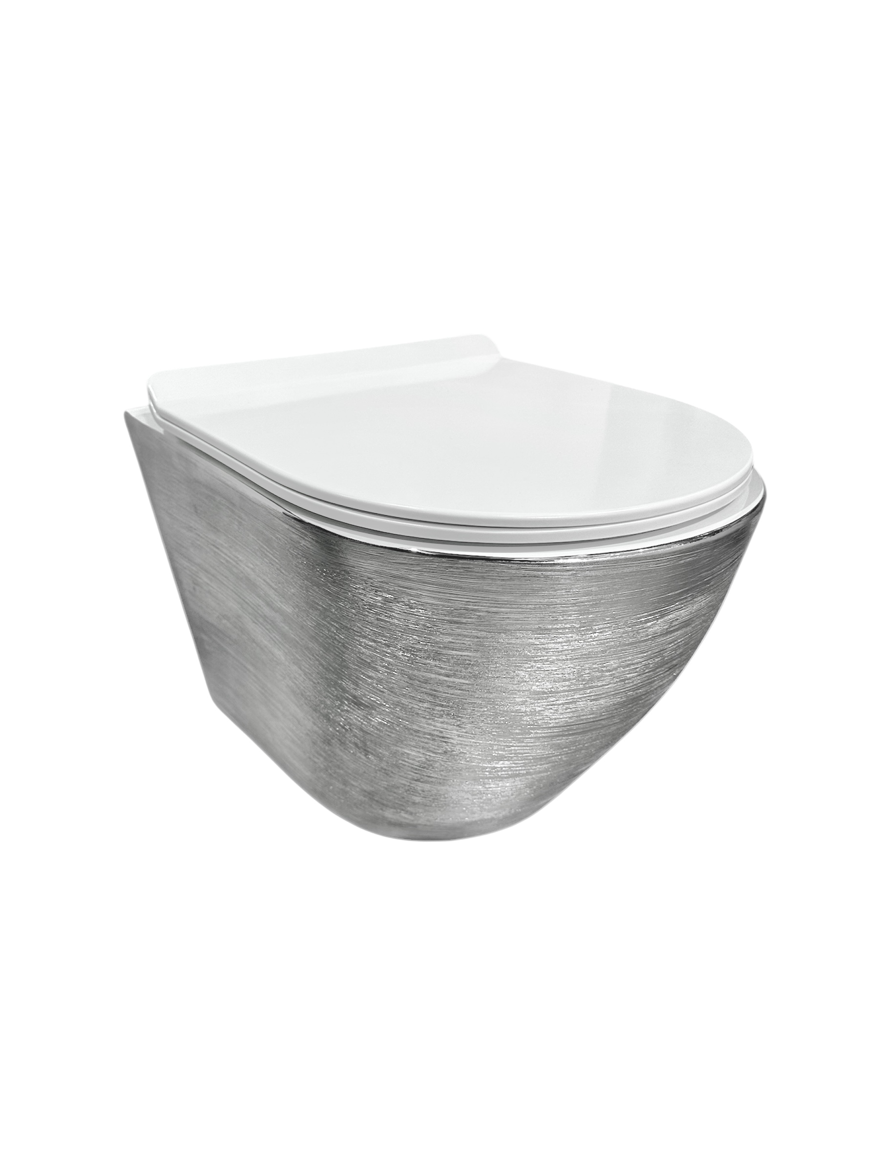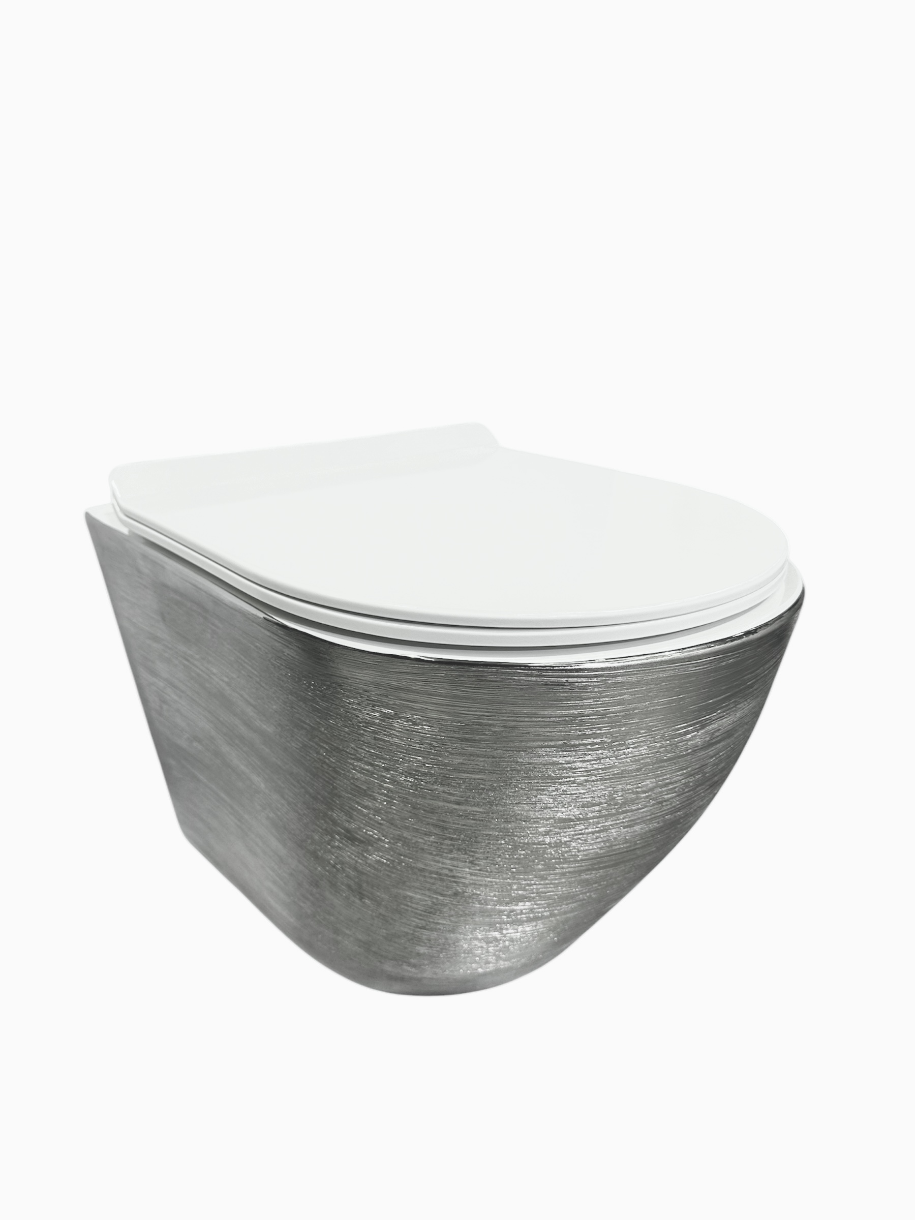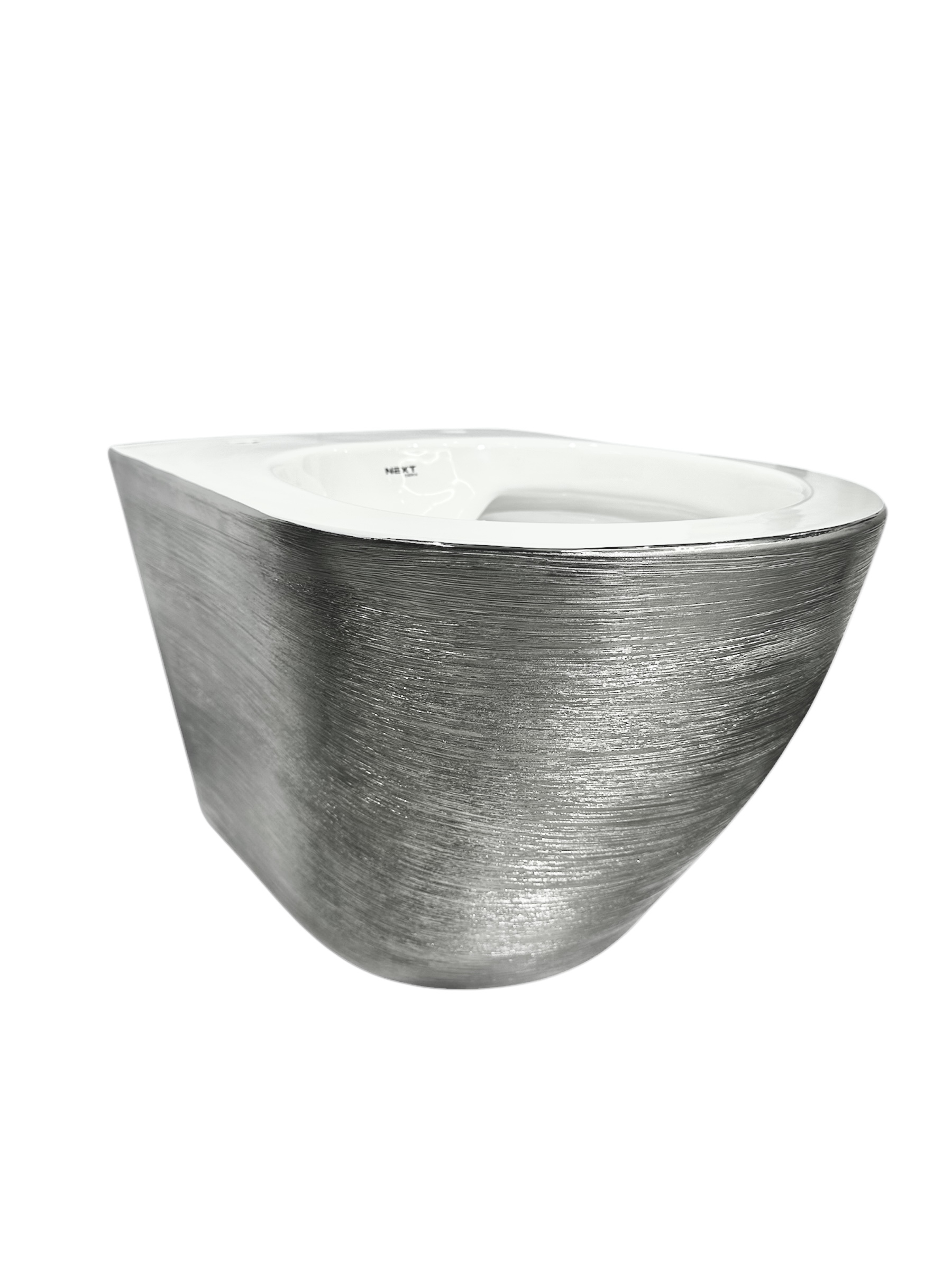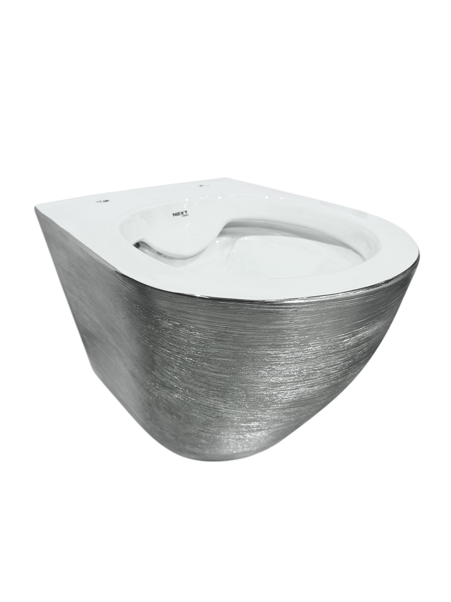 Elevate the aesthetic of your bathroom with this stunning wall-hung one-piece commode, designed to bring sophistication and modernity to your space. The commode features a unique silver textured finish that contrasts beautifully with the crisp white base, creating a luxurious and eye-catching focal point in any bathroom.